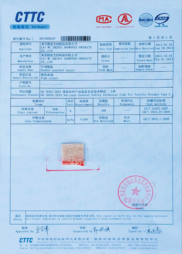 • 本公司生產的無紡阻燃地毯檢測合格